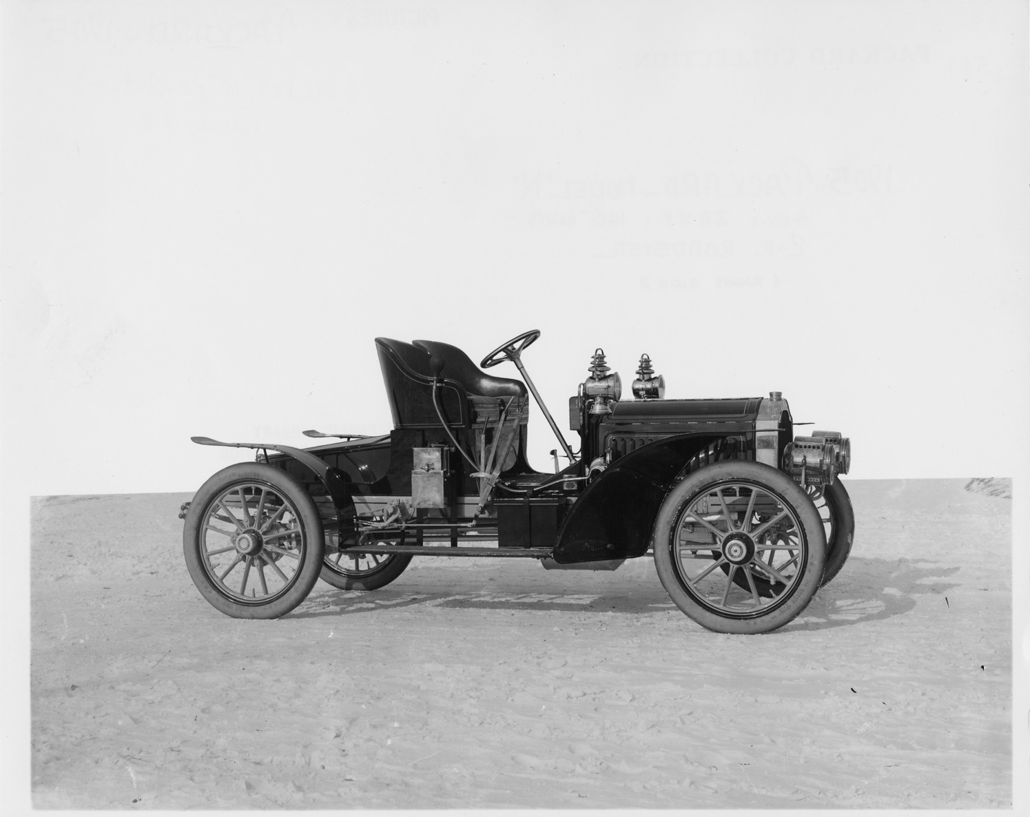 Favorite this☆ 1905 Packard Model N roadster Description: Photograph from glass negative of 1905 Packard Model N, right side view. Inscribed on photo back: "4-cylinder, 28-horsepower, 106-inch wheelbase, 2-person roadster." Details Resource ID: EB01c082 Creator: Packard Motor Car Company Subject: Packard automobile Photographic prints Date Issued: 1905 Format: 1 photographic print ; 8 x 10 in. Member of: National Automotive History Collection Packard Collection Filing Location: Packard, 1905 #1 Rights: Physical rights are retained by DPL. Copyright is retained in accordance with U.S. copyright laws.