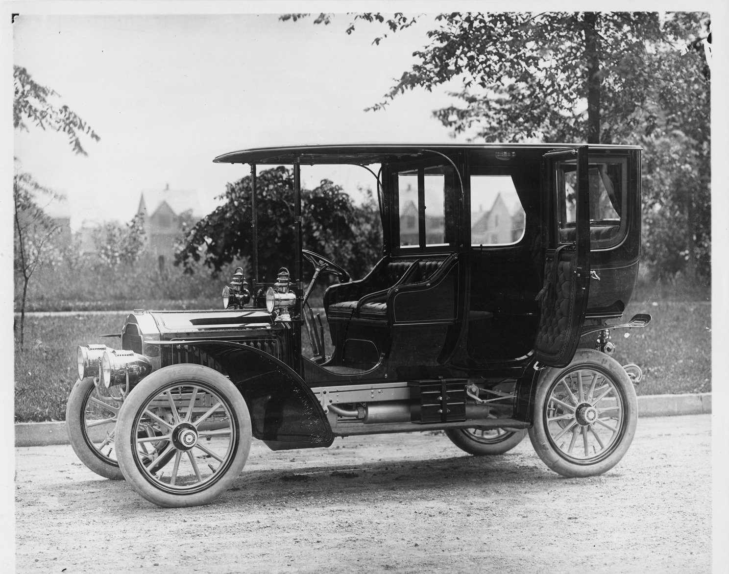 Photograph from glass negative of 1905 Packard Model N. Inscribed on photo back: "4-cylinder, 28-horsepower, 106-inch wheelbase, limousine photographed near the Packard E. Grand Boulevard works, Detroit, Mich. Note: new type rear spring support arms."