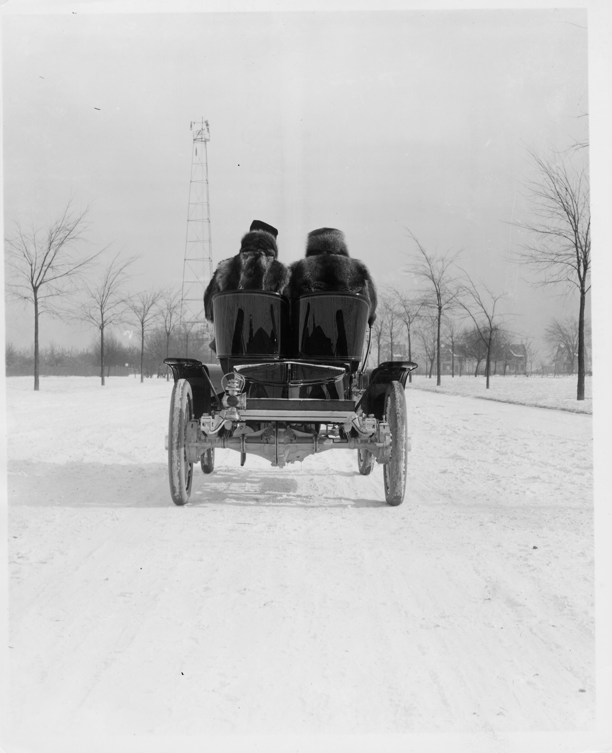 Favorite this☆ 1905 Packard Model N roadster, back view Description: View of 1905 Packard Model N, back view, with two passengers in fur coats on snowy road. Inscribed on photo back: "4-cylinder, 28-horsepower, 106-inch wheelbase, 2-person roadster; photographed near Packard Works, Detroit, Mich." Details Resource ID: EB01c093 Creator: Packard Motor Car Company Subject: Packard automobile Photographic prints Date Issued: 1905 Format: 1 photographic print ; 10 x 8 in. Member of: National Automotive History Collection Packard Collection Filing Location: Packard, 1905 #1 Rights: Physical rights are retained by DPL. Copyright is retained in accordance with U.S. copyright laws.
