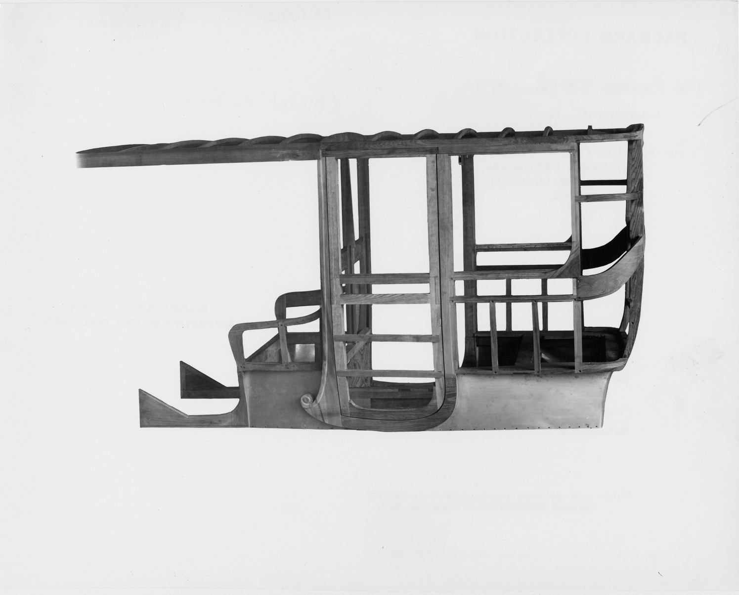 Print copied from glass negative of a 1906 Packard 24 Model S limousine framework. Inscribed on photo back: "Limousine body, left side view of finished framework, ready for aluminum covering, photographed at Packard Works, East Grand Blvd., Detroit, Mich."