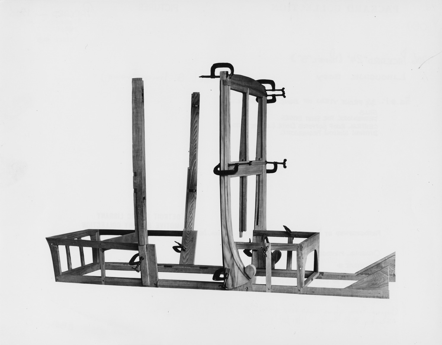 Print copied from glass negative of a 1906 Packard 24 Model S limousine basic framework. Inscribed on photo back: "Limousine body, three-quarter front view of basic framework, sills, framework for seat bases, central roof supports (door & coupe posts), division window framework, photographed at Packard Works, East Grand Blvd., Detroit, Mich."