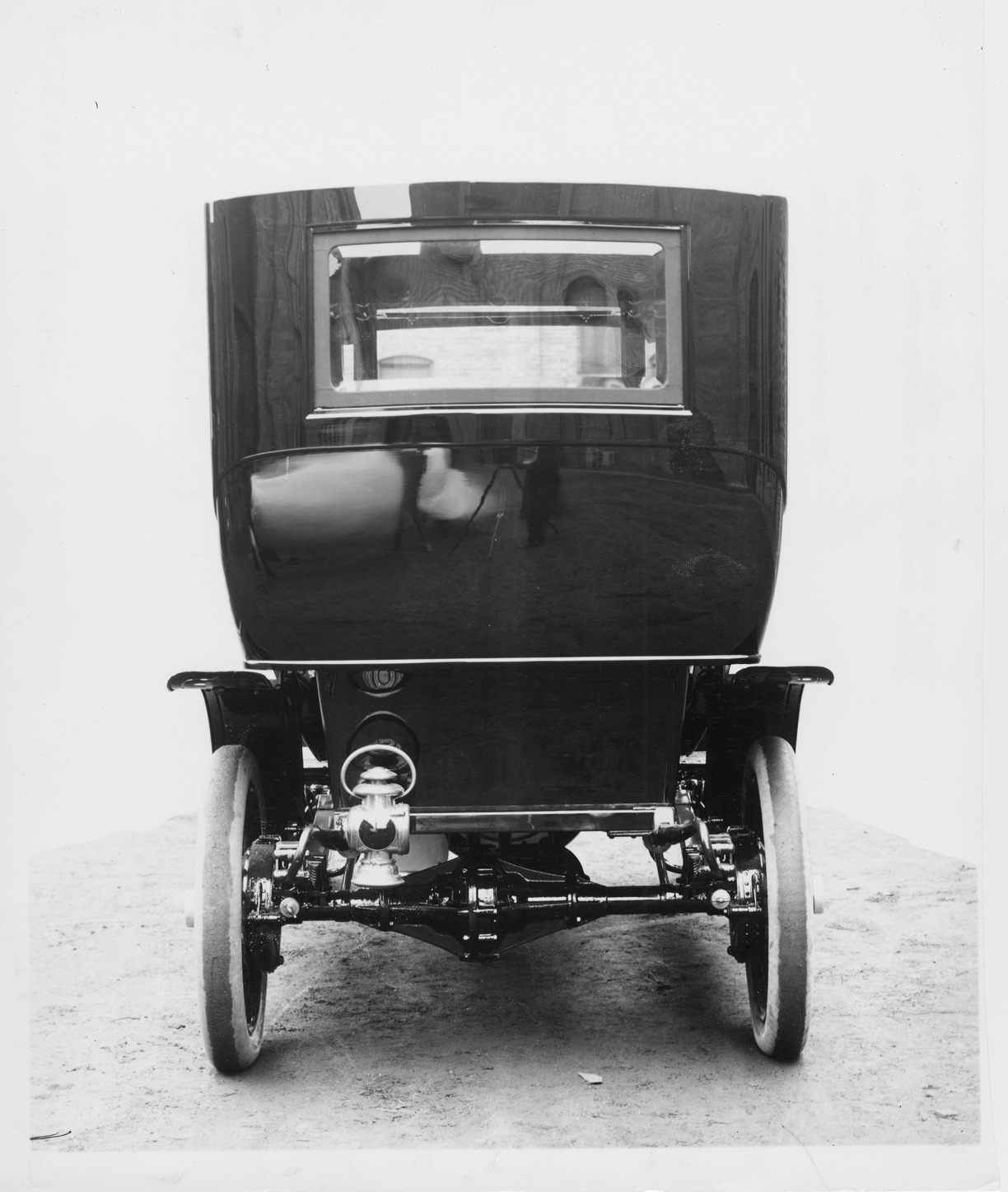 Print copied from glass negative of a 1906 Packard 24 Model S limousine rear elevation. Inscribed on photo back: "4-cylinder, 24-horsepower, 119-inch wheelbase, 5-person touring car, rear elevation, photographed near Packard Works, East Grand Blvd., Detroit, Mich."