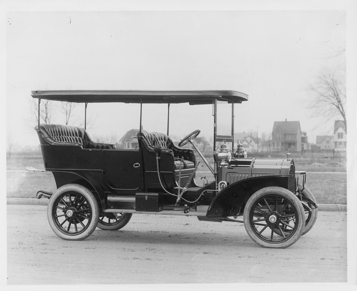 Print copied from a glass negative of a 1907 Packard 30 Model U right side, houses in background. Inscribed on photo back: "4-cylinder, 30-horsepower, 122-inch wheelbase, touring car, fitted with canopy or surrey roof, roll-up side curtains, two piece glass front having upper panel hinged at top to allow it to be folded against under side of roof when desired, 13 louvers on hood side panel, 3 gear/brake levers, photographed near Packard Works, East Grand Blvd., Detroit, Mich."