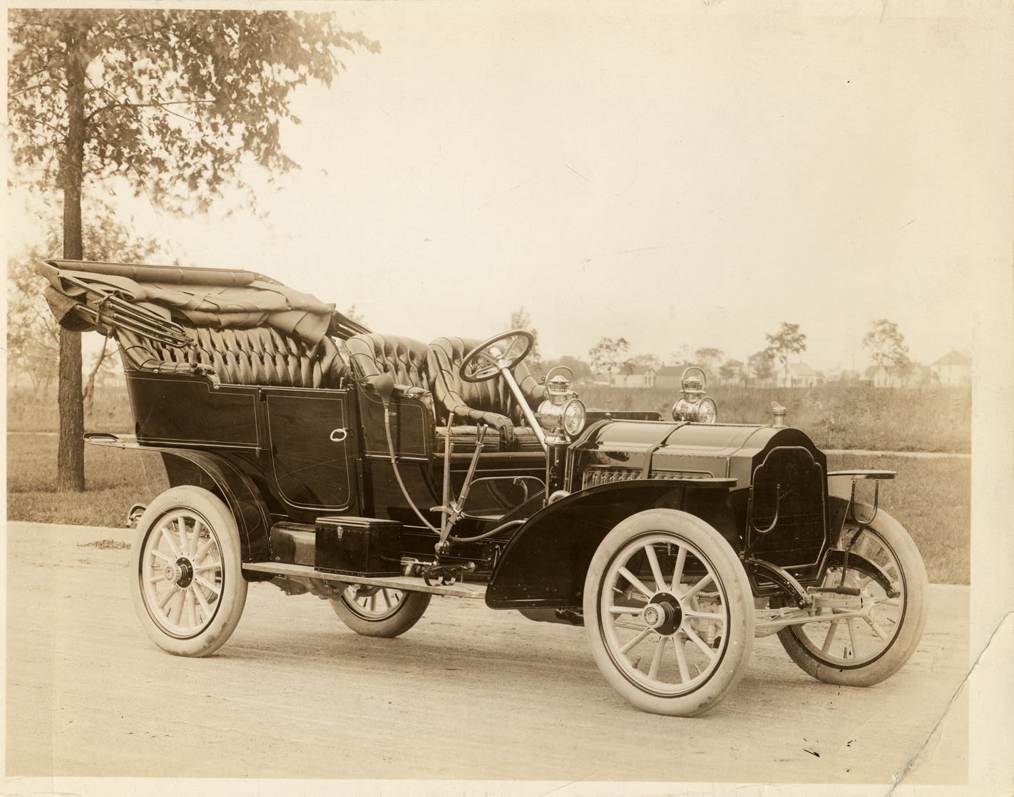 Packard Co. file photograph of a 1907 Packard 30 Model U. Inscribed on photo back: "4-cylinder, 30-horsepower, 122-inch wheelbase, 5-person touring car, front elevation, fitted with folding cape cart top, top folded, 3 brake/gear levers, 13 hood louvers, photographed out back near Packard Works, East Grand Blvd., Detroit, Mich."