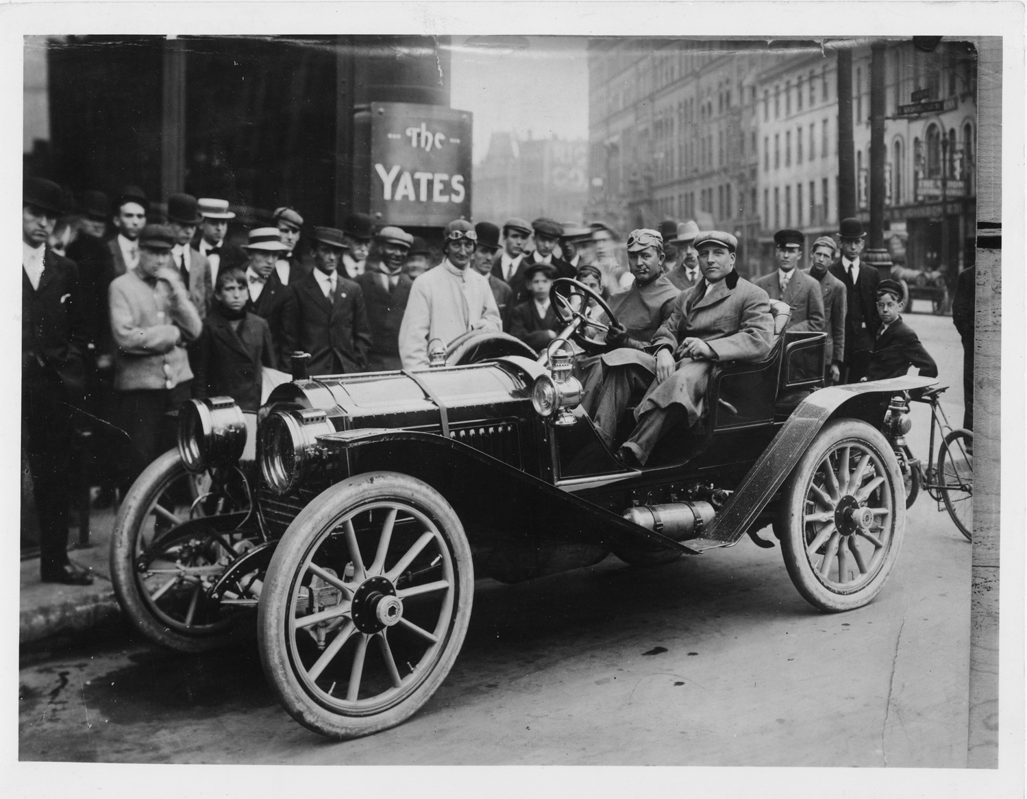 Print copied from a glass negative of a 1908 Packard 30 Model UA parked on city street with crowd of onlookers, in front of The Yates. Inscribed on photo back: "4-cylinder, 30-horsepower, 108-inch wheelbase, 2/3-person runabout, driver Barney Oldfield, passenger C. Arthur Benjamin, a Packard distributor in Syracuse, N.Y."