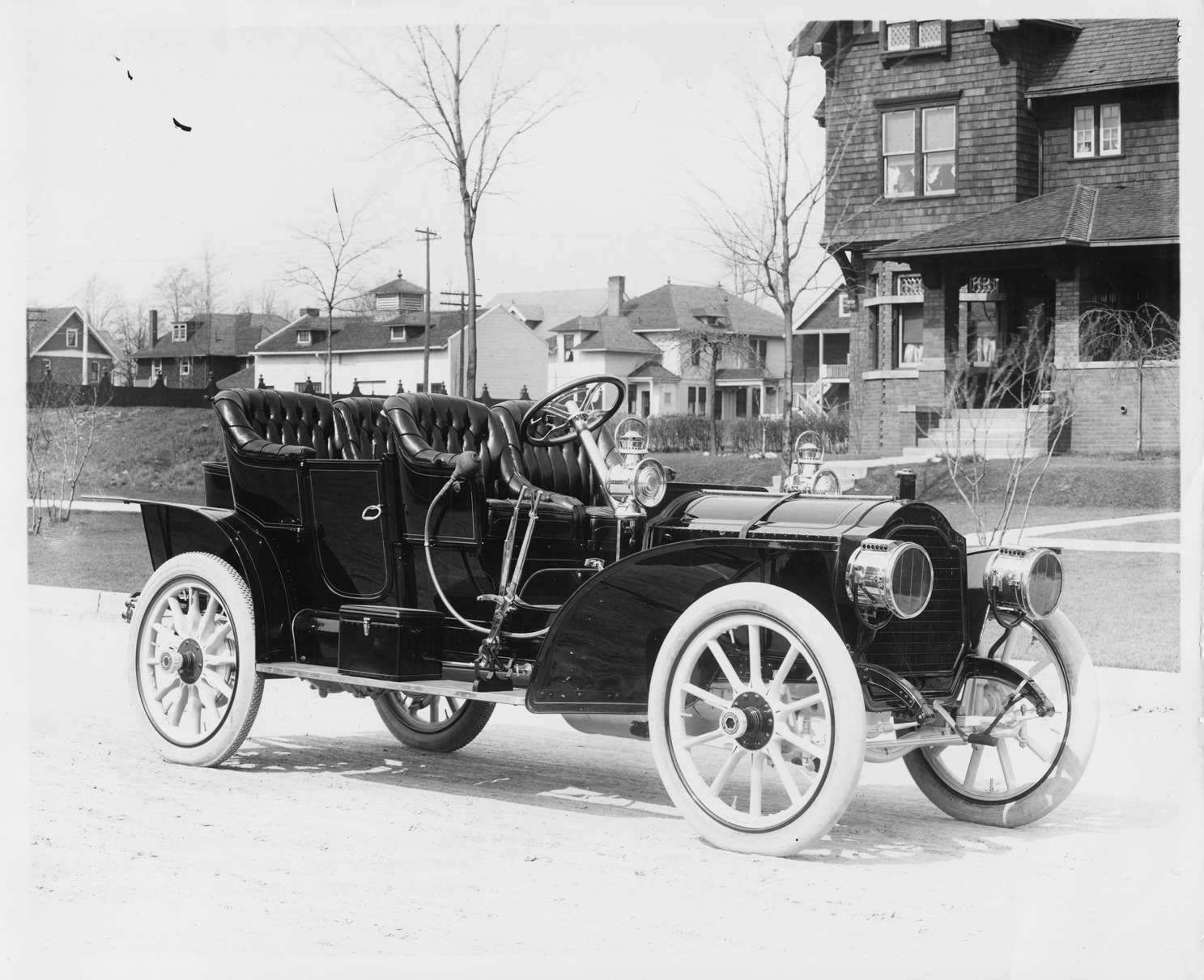 1908 Packard 30 Model UA close-coupled with rumble seat parked on residential street