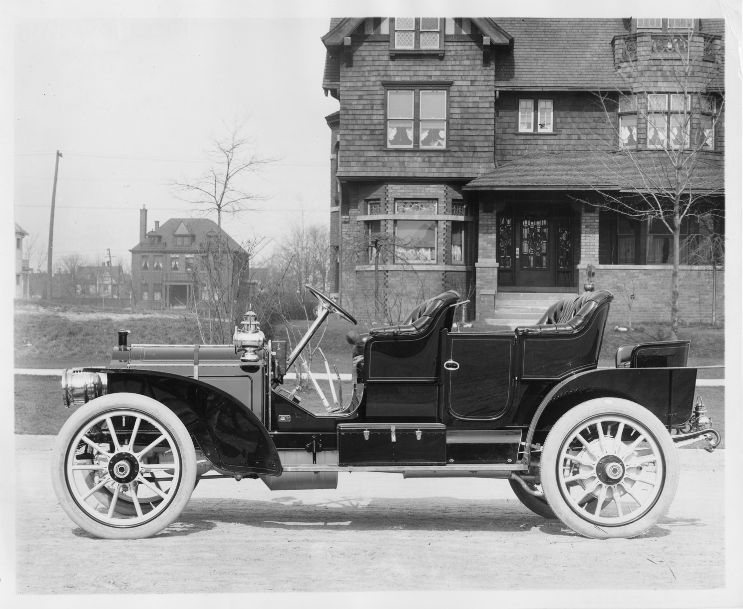 Print copied from glass negative of a 1908 Packard 30 Model UA three-quarter front view left side, parked on a residential street, brick house in right background. Inscribed on photo back: "4-cylinder, 30-horsepower, 123.5-inch wheelbase, 4-person close-coupled, with rumble seat, this body type introduced c. March 1908, 1908 Model UA radiator cap, tube type radiator, solid hood side panel, no louvers, 3 gear/brake levers, metal aprons fitted between fenders and frame, body plate on forward end of body sill-left side reads "body made by Packard Motor Car Co., Detroit, Mich. USA," photographed in Detroit, Mich."