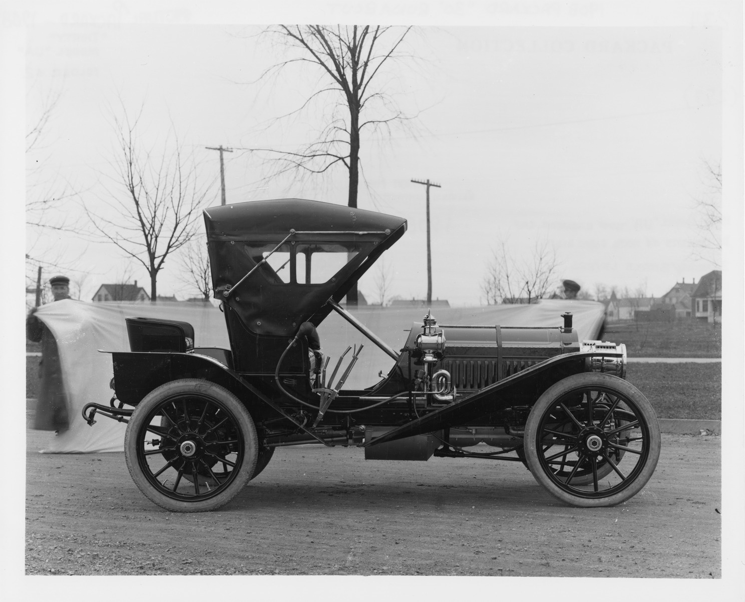 Packard file photograph of a 1908 Packard 30 Model UA right side, parked on street, two men in background. Inscribed on photo back: "4-cylinder, 30-horsepower, 108-inch wheelbase, runabout, 2-person with rumble seat, folding front windshield, standard folding buggy top, with snap-on side curtain panes in place, 1908 type radiator cap, 14 louvers on hood side panel, 3 gear/brake levers, photographed near Packard Works, East Grand Blvd., Detroit, Mich."