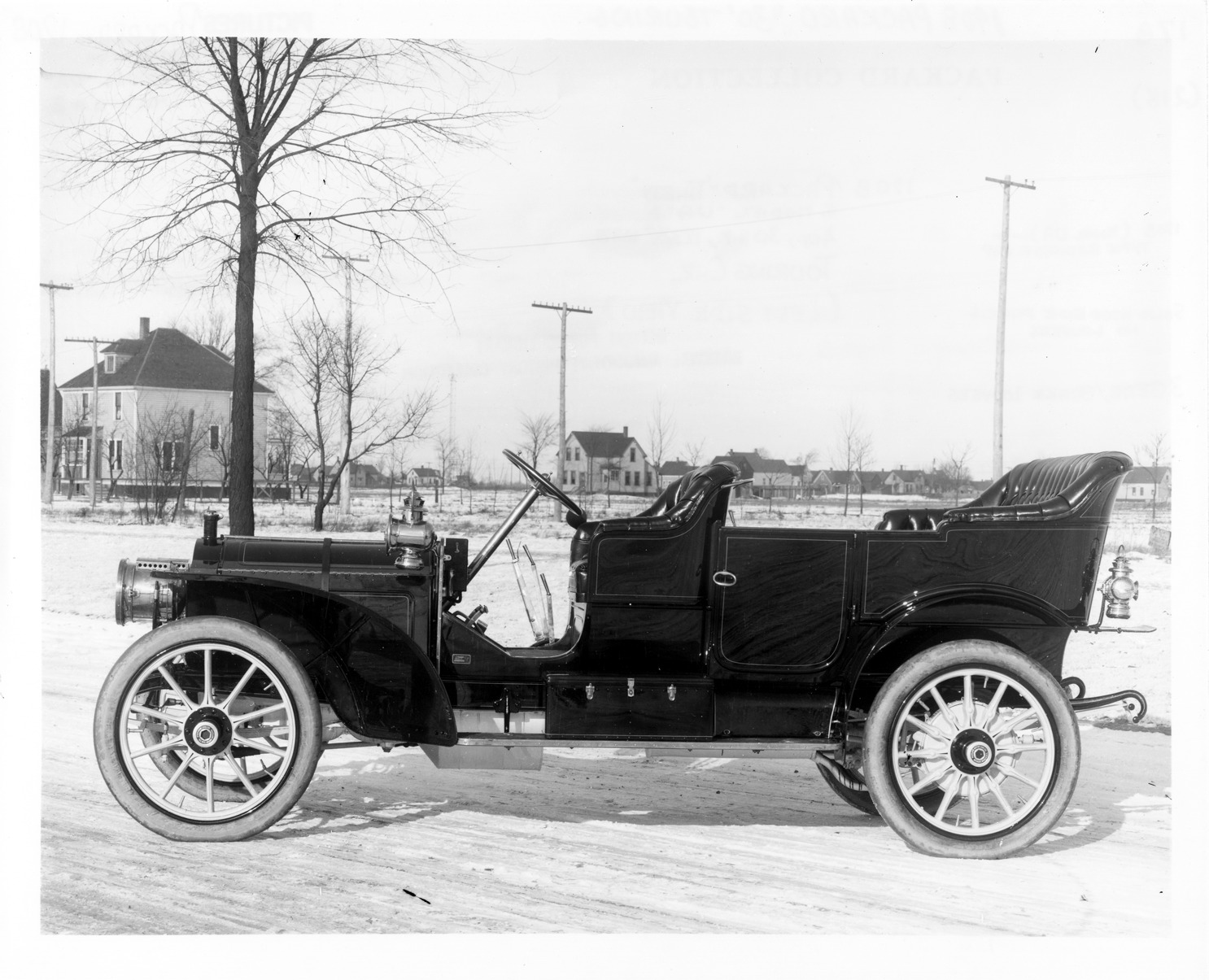 Packard Co. file photograph of a 1908 Packard 30 Model UA parked on a winter road, with houses in background, left side view. Inscribed on photo back: "4-cylinder, 30-horsepower, 123.5-inch wheelbase, touring car, 1908 Model UA type radiator cap, solid hood side panels, no louvers, 3 gear/brake levers, body plate "body by Packard Motor Car Co. Detroit, Mich. USA" on forward end of body rail, photographed near Packard Works, East Grand Blvd., Detroit, Mich."