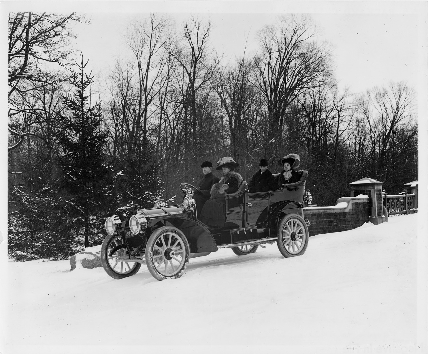 Print copied from a glass negative of a 1909 Packard 30 Model UB in winter with two couples, trees and stone wall in background. Inscribed on photo back: "4-cylinder, 30-horsepower, 123.5-inch wheelbase, touring car."