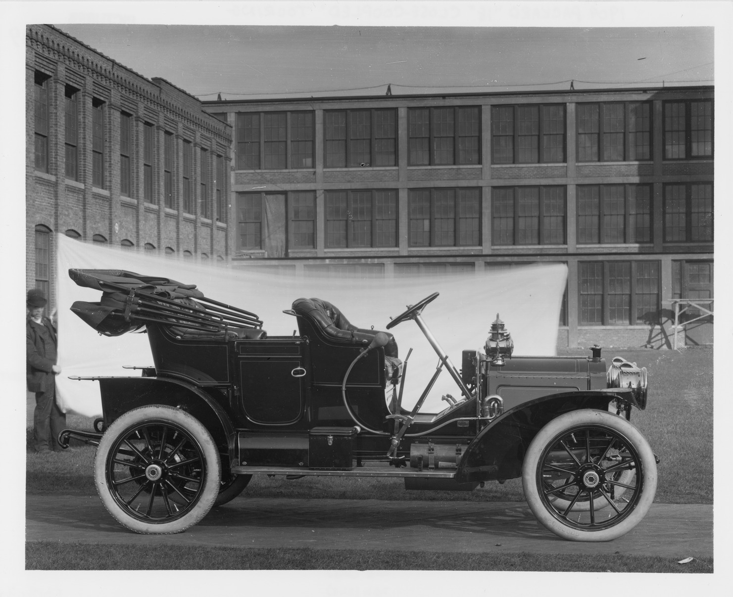 Packard Co. file photograph of a 1909 Packard 18 Model NA brick factory buildings in background. Inscribed on photo back: "4-cylinder, 18-horsepower, 112-inch wheelbase, close-coupled, fitted with folding cape cart top & four bucket type seats, right side view, top lowered, photographed at Packard Works, East Grand Blvd., Detroit, Mich."