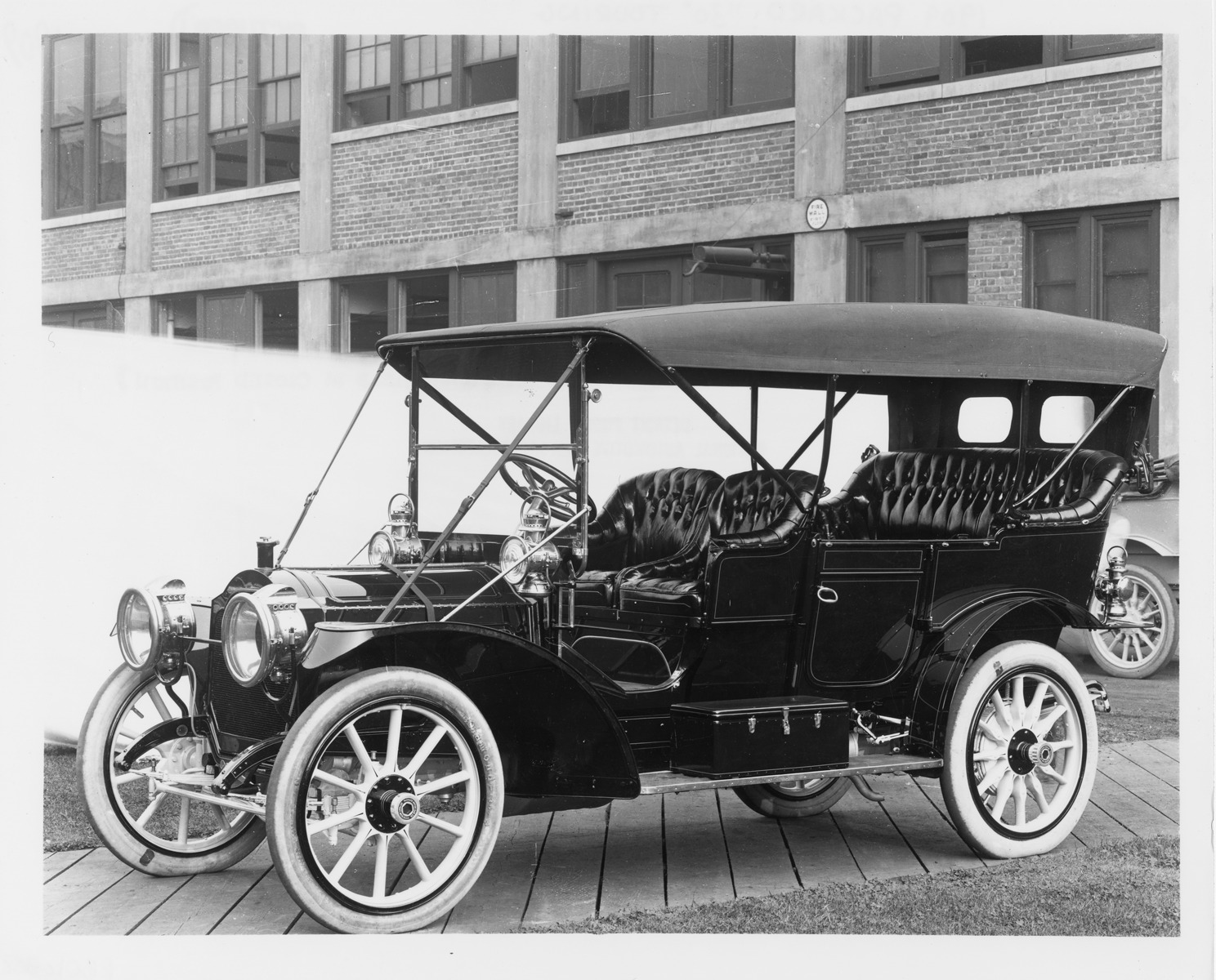 Packard Co. file photograph of a 1909 Packard 30 Model UB, brick factory building in background, top up. Inscribed on photo back: "4-cylinder, 30-horsepower, 123.5-inch wheelbase, touring car, fitted with cape top & 2-piece folding glass front, three-quarter front view, left side."