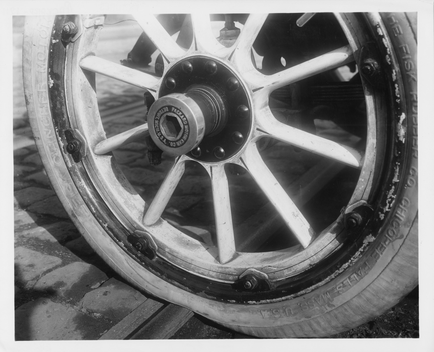 Packard Co. file photograph of a 1911 Packard 30 Model UD rear view, on a muddy country road. Inscribed on photo back: "4-cylinder, 30-horsepower, 123.5-inch wheelbase, 7-person touring car, fitted with extension cape top & side curtains, rear mounted carrier for two additional spare tires."