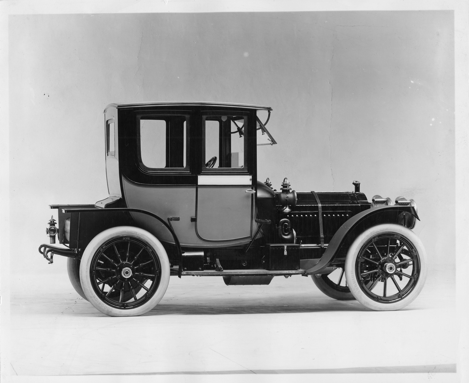 Print copied from a glass negative of a 1911 Packard 30 Model UDS top portion of front windshield open. Inscribed on photo back: "4-cylinder, 30-horsepower, 108/114-inch wheelbase, coupe, three-quarter rear view, right side."