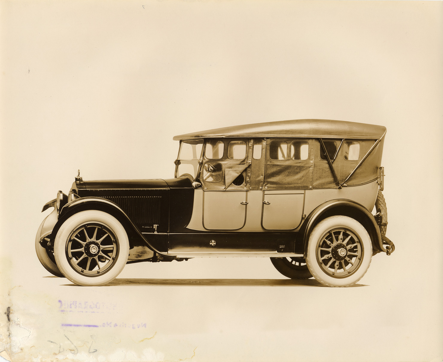 Favorite this☆ 1911 Packard two-toned touring car with light colored folding top Description: Packard Co. file photograph of a 1911 Packard touring car, two-toned, with light colored folding top, spare tire carried at back. Inscribed on photo back: "7-person touring car." Details Resource ID: EB01c385 Creator: Packard Motor Car Company Subject: Packard automobile Photographic prints Date Issued: 1911 Format: 1 photographic print ; 8 x 10 in. Member of: National Automotive History Collection Packard Collection Rights: Physical rights are retained by DPL. Copyright is retained in accordance with U.S. copyright laws.