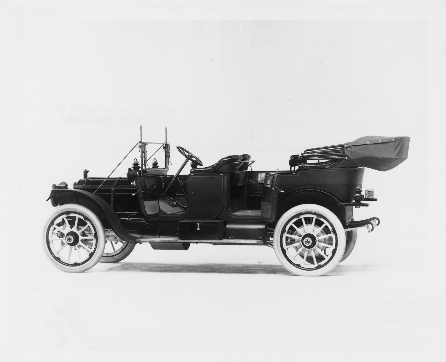 Print copied from a glass negative of a 1911 Packard 30 Model UD. Inscribed on photo back: "4-cylinder, 30-horsepower, 123.5-inch wheelbase, 7-person touring car, fitted with extension cape cart top, windshield, three-quarter rear view, left side, top lowered, license plate Michigan 1910 #5062M."