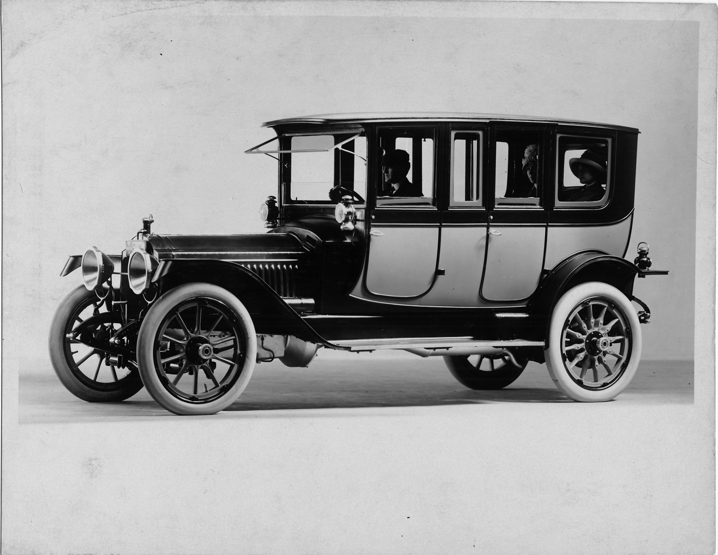 Packard Co. file photograph of a 1913 Packard 48 (1348) five-sixth front view, right side, two-toned, male driver and two female passengers visible. Inscribed on photo back: "6-cylinder, 48-horsepower ALAM rating, 82-horsepower at 1720 r.p.m., 139-inch wheelbase, double-compartment brougham."