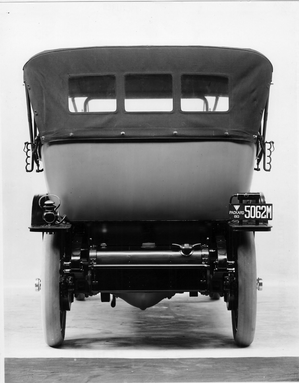 Print copied from a glass negative of a 1913 Packard 48 (1348) rear view, two-toned, Packard 1913 #5062M license plate. Inscribed on photo back: "6-cylinder, 48-horsepower ALAM rating, 82-horsepower at 1720 r.p.m., 139-inch wheelbase, 7-person touring car, top raised, 2-48 positioning of exhaust pipe, lack of valances on the insides of rear fender ends, overhang of body at rear."