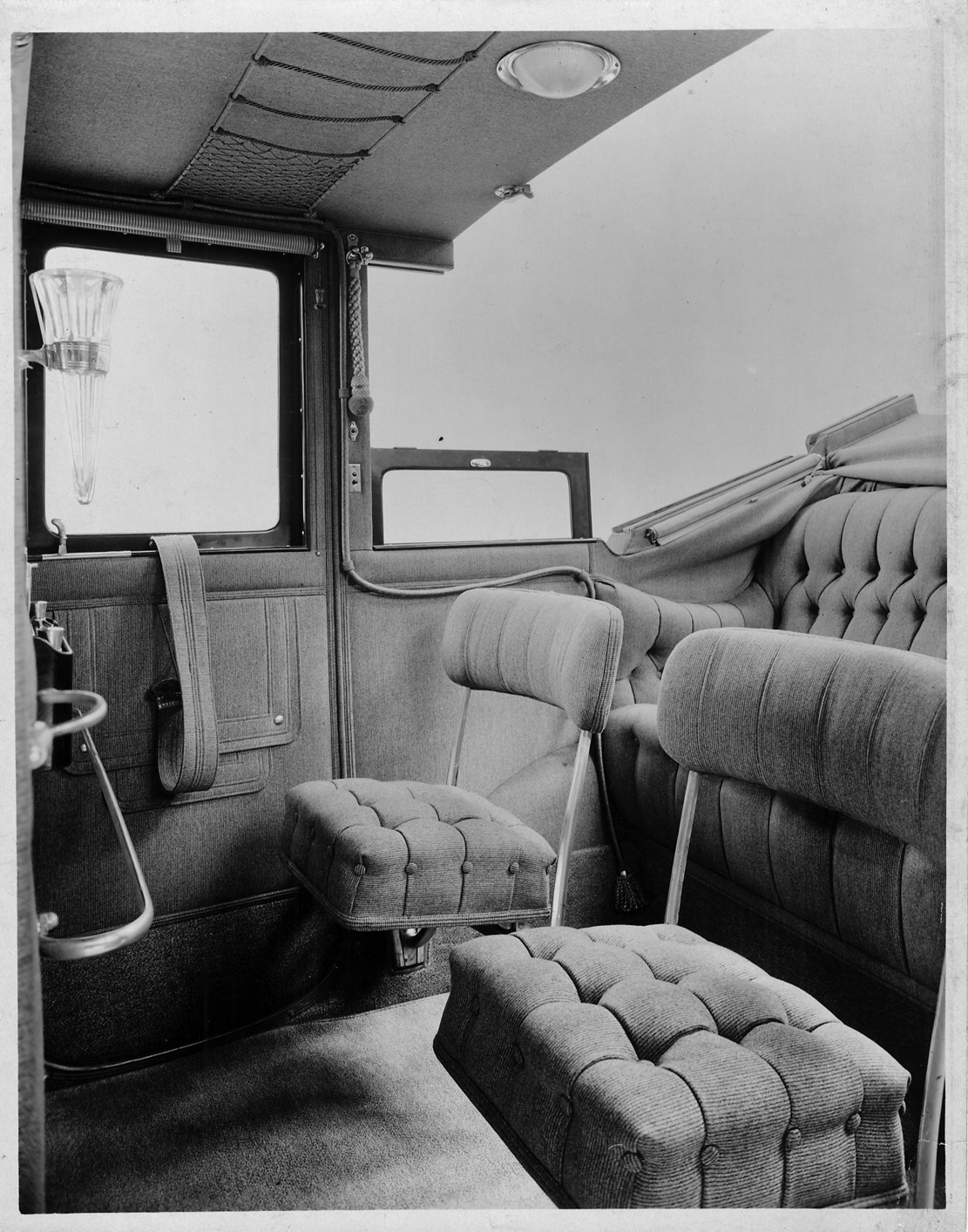 Favorite this☆ 1913 Packard 48 landaulet, interior detail Description: Packard Co. file photograph of a 1913 Packard 48 interior detail, quarter collapsed. Inscribed on photo back: "6-cylinder, 48-horsepower ALAM rating, 82-horsepower at 1720 r.p.m., 139-inch wheelbase, 7-person landaulet, fitted with side-folding auxiliary seats." Details Resource ID: EB01c569 Creator: Packard Motor Car Company Subject: Automobiles--Interiors Automobiles--Seats Packard automobile Photographic prints Date Issued: 1913 Format: 1 photographic print ; 7.5 x 9.5 in. Member of: National Automotive History Collection Packard Collection Rights: Physical rights are retained by DPL. Copyright is retained in accordance with U.S. copyright laws.