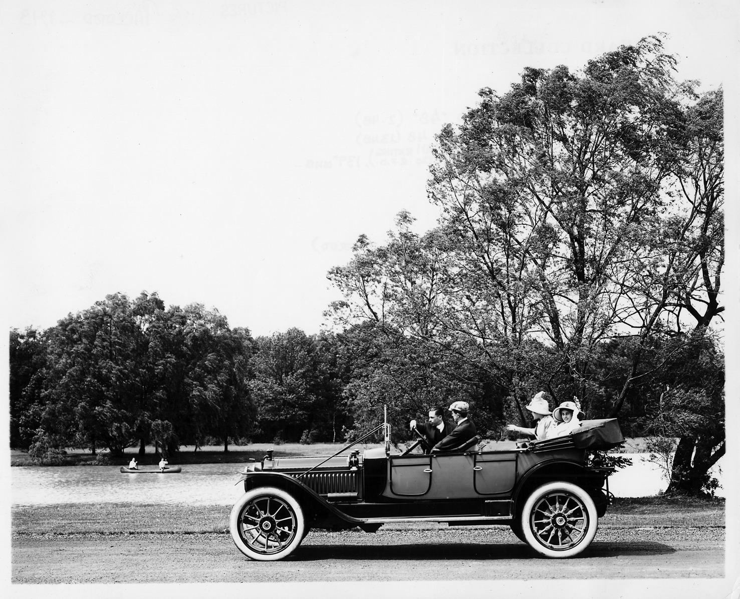 Packard Co. file photograph of a 1913 Packard 48 on Belle Isle top folded, male driver, two female passengers, one male passenger. Inscribed on photo back: "6-cylinder, 48-horsepower ALAM rating, 82-horsepower at 1720 r.p.m., 139-inch wheelbase, 5-person phaeton, left elevation. Duplicate of EB01c495 (sepia-toned)."