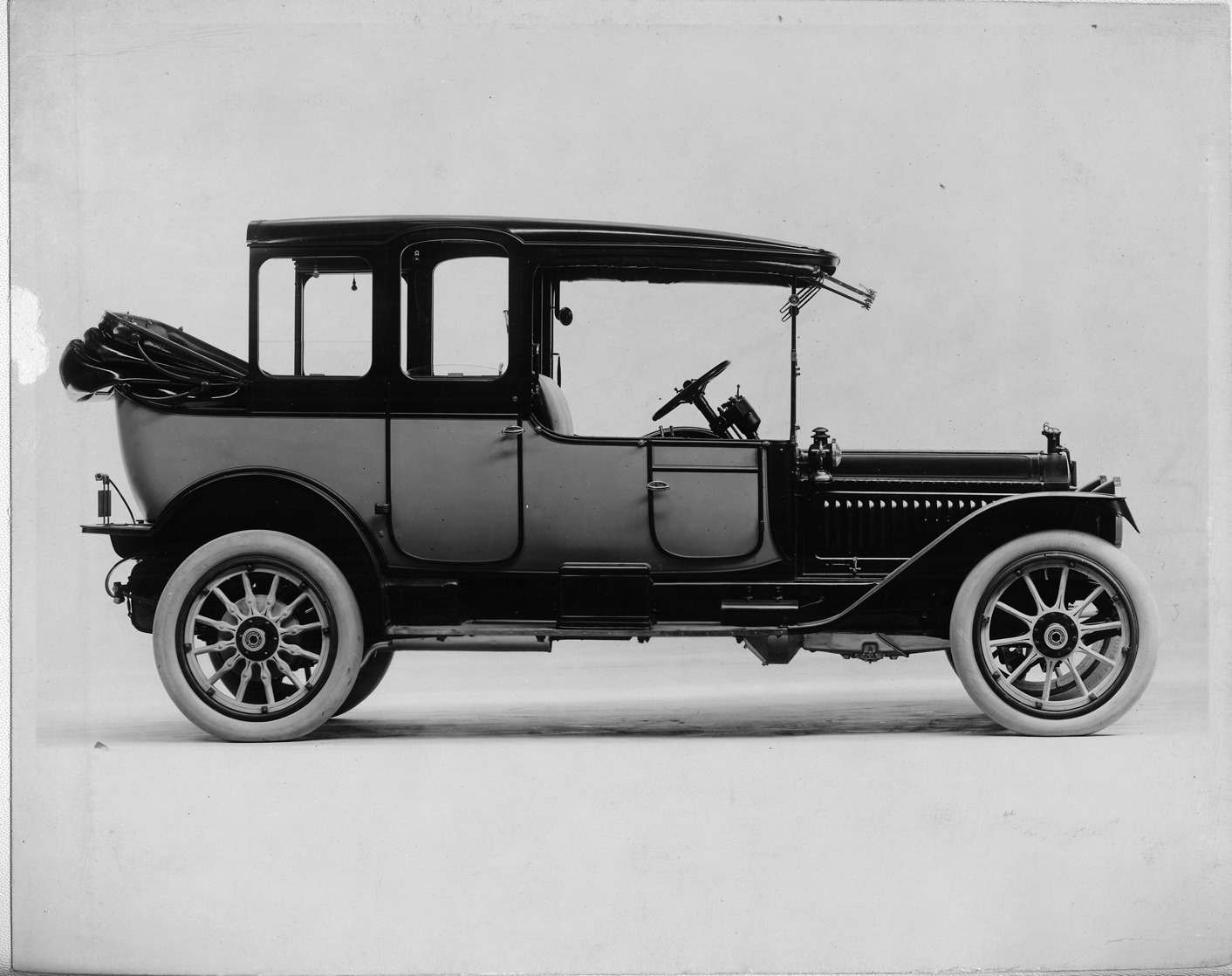 Packard Co. file photograph of a 1914 Packard 48 two-toned. Inscribed on photo back: "6-cylinder, 48-horsepower, 139-inch wheelbase, series third 48, 7-person landaulet, right side, quarter collapsed."