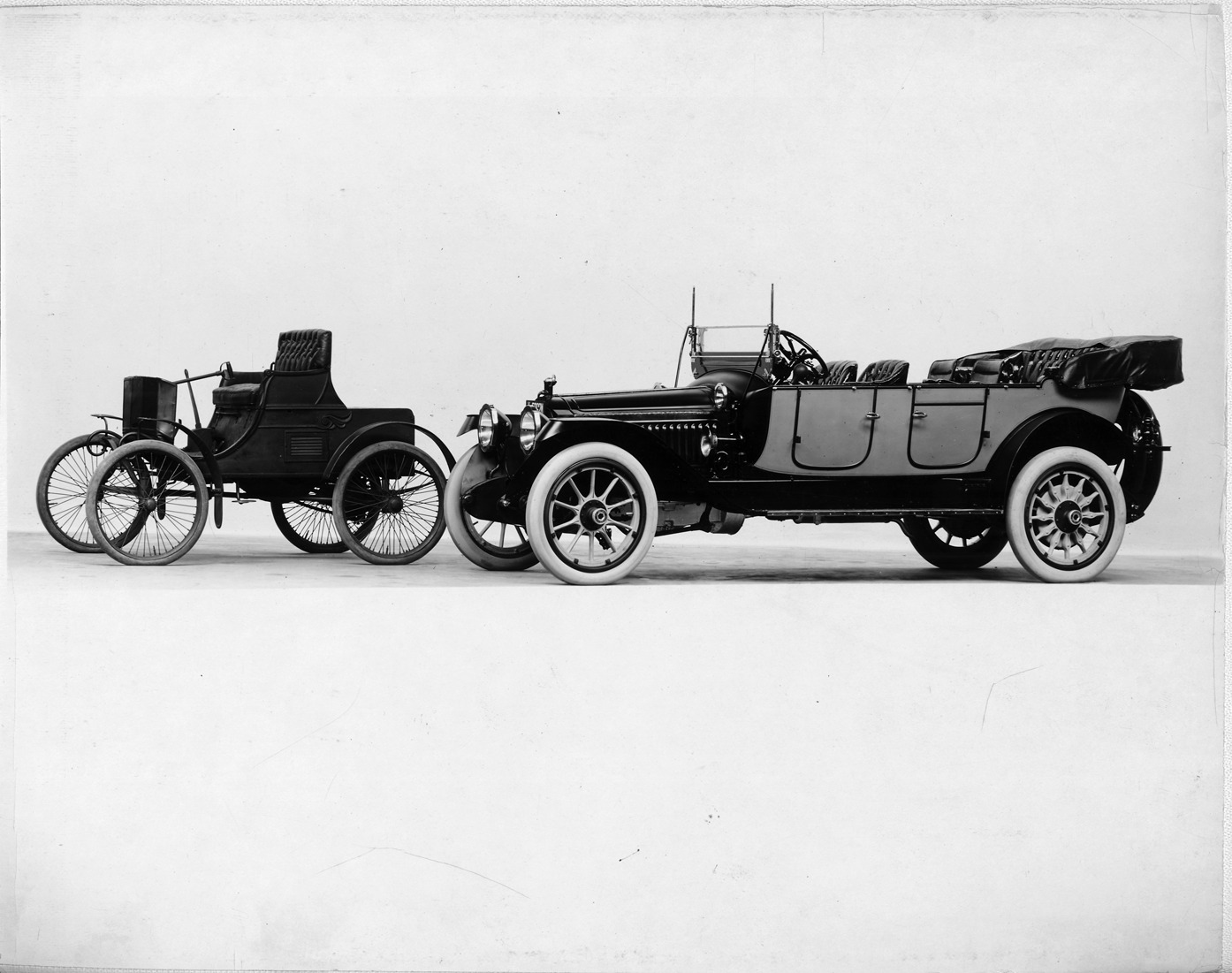 Packard Co. file photograph of a 1914 Packard 2-38 left side, top folded, with 1899 Packard Model A left side. Inscribed on photo back: "Model A 1-cylinder, 9-horsepower, 71.5-inch wheelbase, 2-person roadster, on left, 2.38 on right, 6-cylinder, 38-horsepower, 140-inch wheelbase, series second 38, 6-person salon touring car."