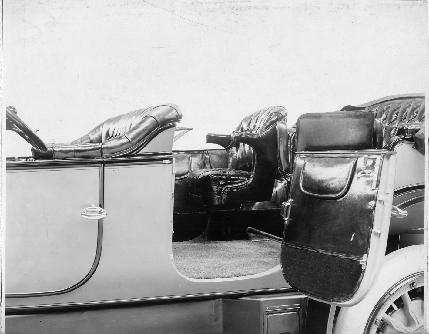 Packard Co. file photograph of a 1914 Packard 2-38 detail of rear interior, rear left side door ajar. Inscribed on photo back: "6-cylinder, 38-horsepower, 140-inch wheelbase, series second 38, 7-person touring car, interior tonneau from left, top folded."