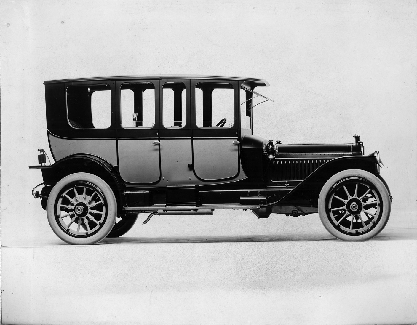 Packard Co. file photograph of a 1914 Packard 48 right side, two-toned. Inscribed on photo back: "6-cylinder, 48-horsepower, 139-inch wheelbase, series third 48, 4-person salon brougham."