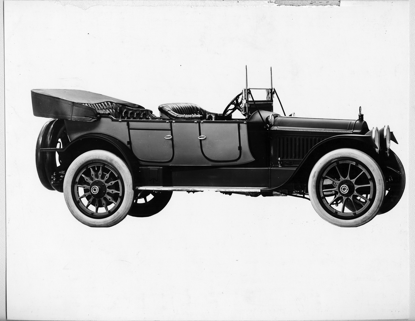 Packard Co. file photograph of a 1916 Packard 1-25 right side, top lowered. Inscribed on photo back: "12-cylinder, 88-horsepower, 125-inch wheelbase, first series twin six, 5-person phaeton."