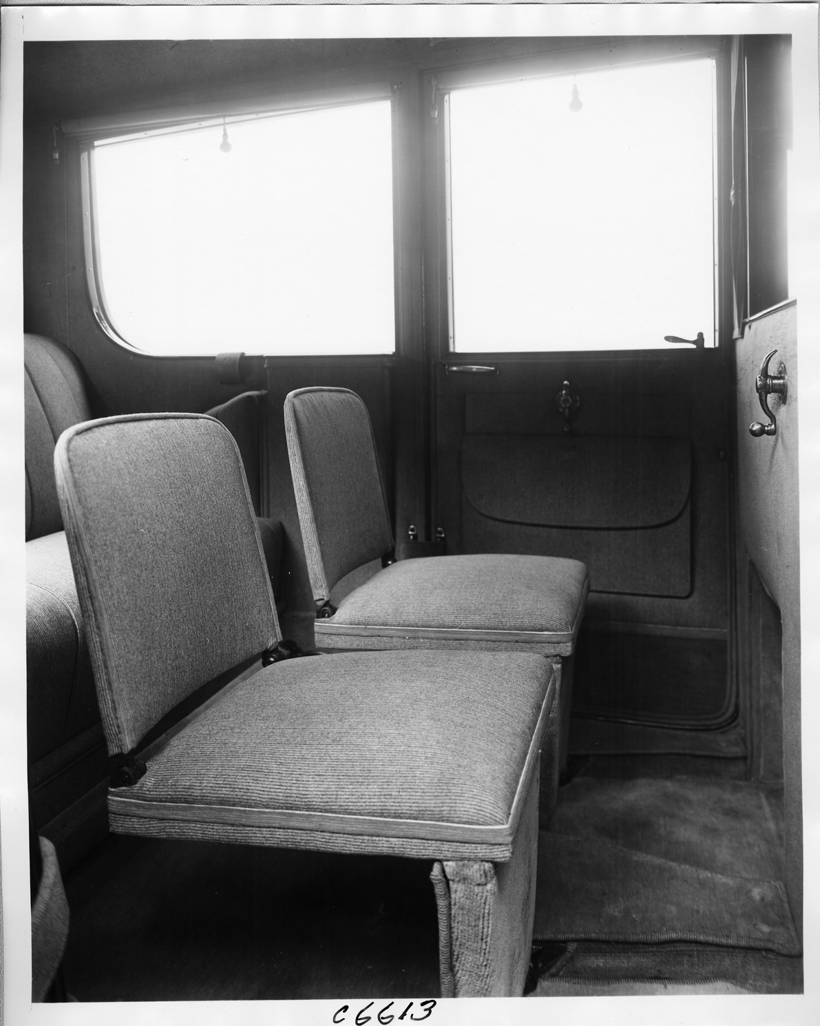 1917 Packard limousine, view of rear interior from side door, showing side-folding auxiliary seats