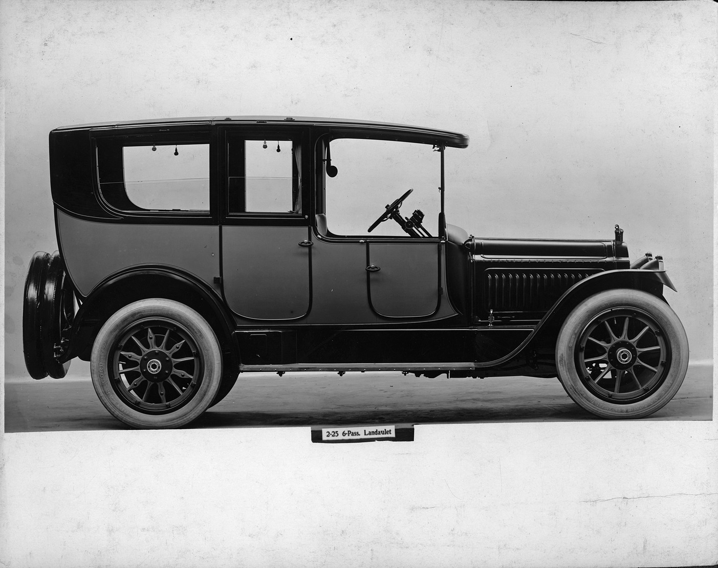 Favorite this☆ 1917 Packard two-toned landaulet, right side view Description: Packard Co. file photograph of a 1917 Packard two-toned, right side view, quarter closed. Inscribed on photo back: "12-cylinder, 88-horsepower, 126.5-inch wheelbase, 2-25 second series twin six, 6-person landaulet (body type #153)." Details Resource ID: EB01c813 Creator: Packard Motor Car Company Subject: Packard automobile Photographic prints Date Issued: 1917 Format: 1 photographic print ; 7.5 x 9.5 in. Member of: National Automotive History Collection Packard Collection Rights: Physical rights are retained by DPL. Copyright is retained in accordance with U.S. copyright laws.