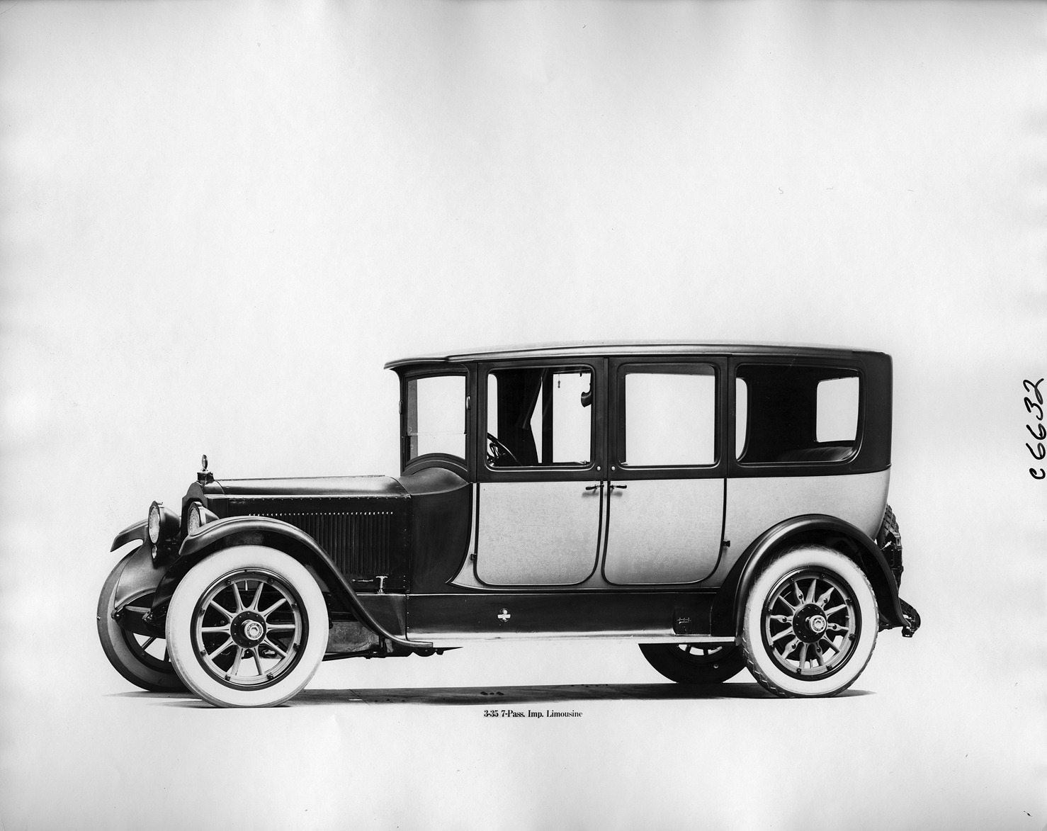 Packard Co. file photograph of a 1918 Packard nine-tenths left front view, two-toned, no cover on spare tire, back tires and spare have diamond-shaped treads. Inscribed on photo back: "Model 3-35, 7-person imperial limousine."