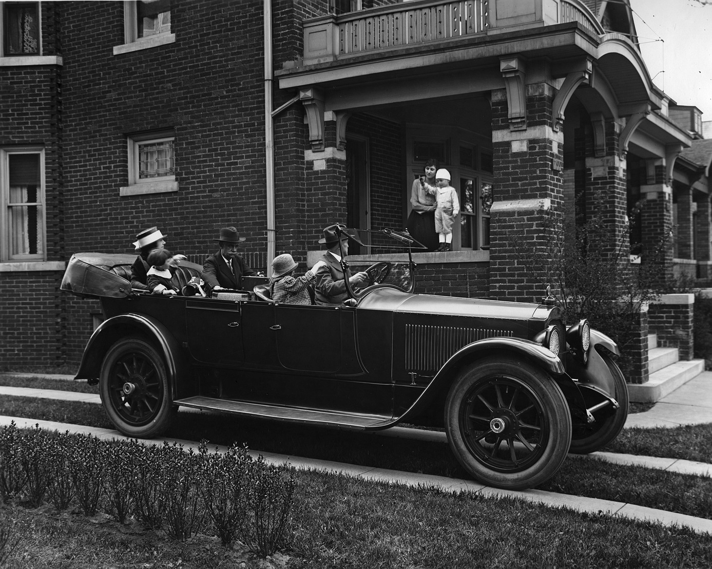 Packard Co. file photograph of a 1918 Packard, top folded, male driver, one male, one female, and two child passengers, parked in driveway of large brick home, woman standing with a small child waving on porch. Inscribed on photo back: "Model 3-25, 5-person phaeton."