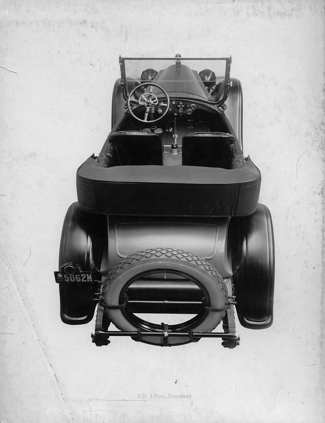 Packard Co. file photograph of a 1918-1919 Packard with a 1917 Michigan license plate #5062M, no cover on spare tire and has diamond-shaped treads. Inscribed on photo back: "12-cylinder, 90-horsepower, 128-inch wheelbase, third series twin six (produced 8.1917-8.1919), 3-25, 4-person runabout (body type #171), elevated view from rear, top folded."