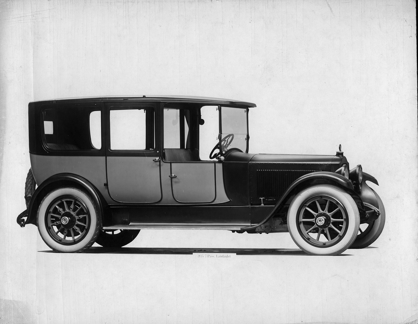 Packard Co. file photograph of a 1918-1919 Packard seven-eights right front view, quarter closed, two-toned, back and spare tires have diamond-shaped treads. Inscribed on photo back: "12-cylinder, 90-horsepower, 136-inch wheelbase, third series twin six, 3-35, 7-person landaulet (body type #180)."
