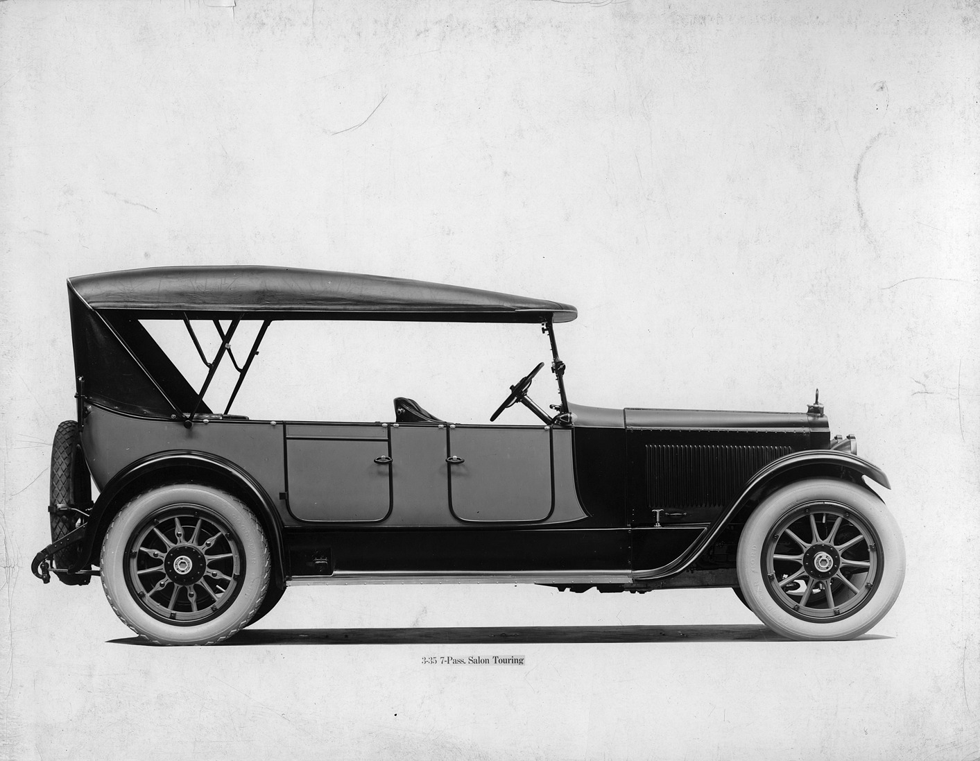 Packard Co. file photograph of a 1918-1919 Packard left side view, two-toned, back and spare tires have diamond-shaped treads, top raised. Inscribed on photo back: "12-cylinder, 90-horsepower, 136-inch wheelbase, third series twin six, 3-35, 7-person salon touring car (body type #177)."