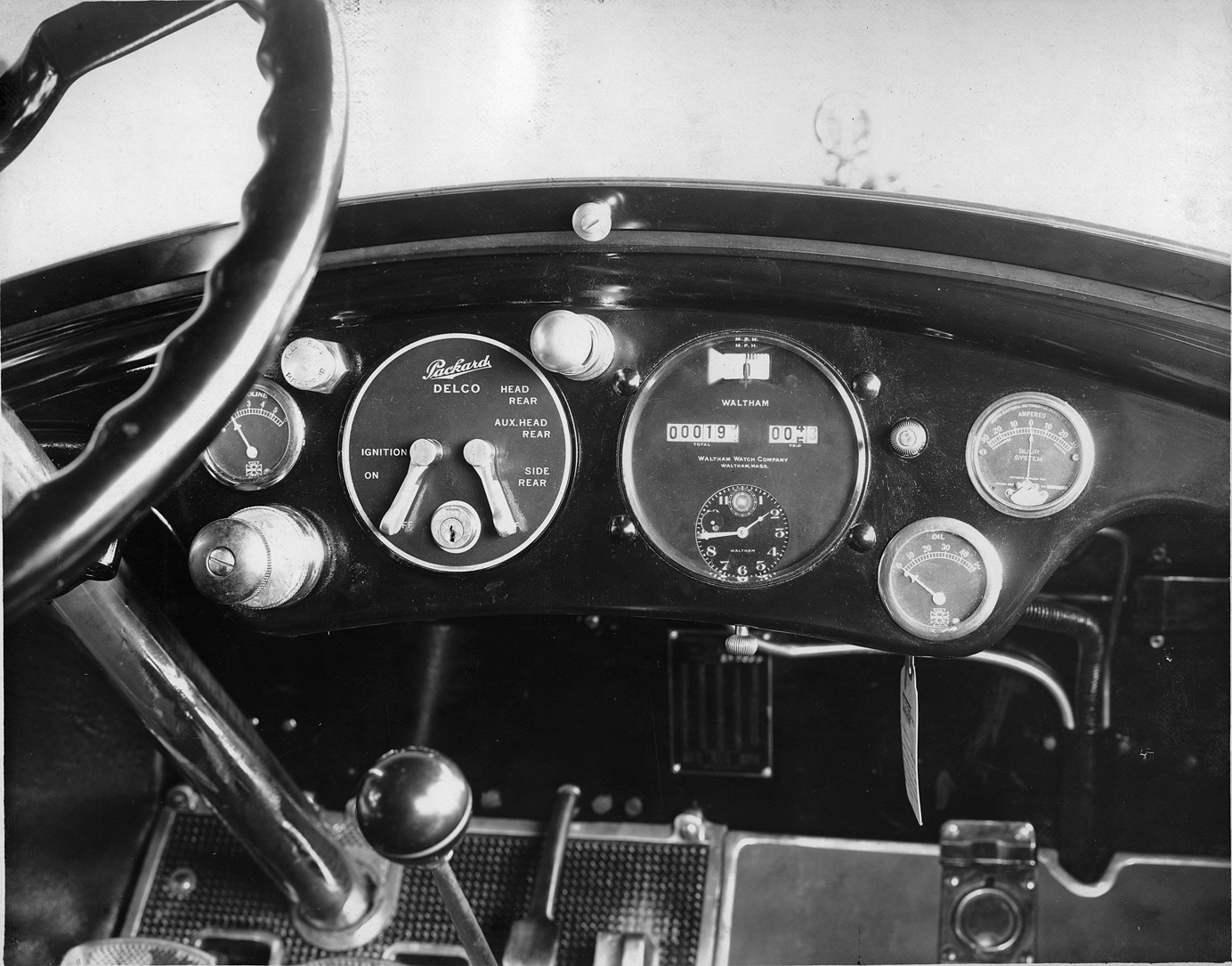 Packard Co. file photograph of a 1918-1919 Packard close-up of instrument panel, showing ignition, oil, gasoline, and amperes gauges, also visible is the motometer. Inscribed on photo back: third series twin six, instrument board."
