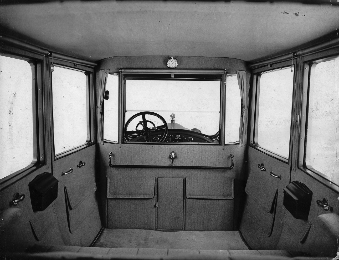 1918-1919 Packard limousine, view of interior from rear seat