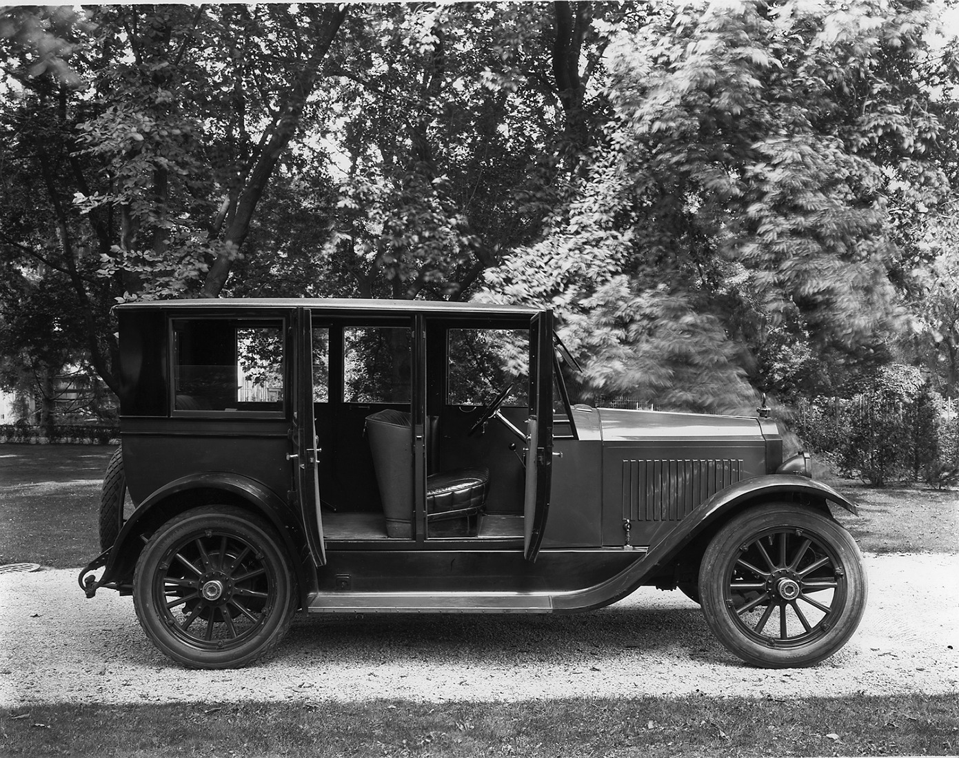 1921-1922 Packard sedan, parked in drive, right side view, doors open to reveal interior