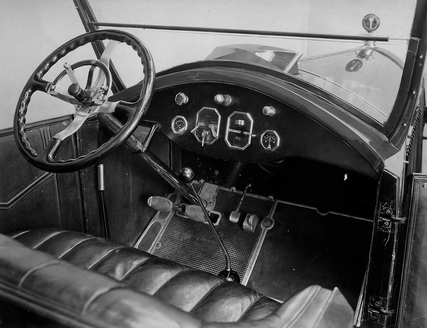 1921-1922 Packard open-body type car, view of instrument panel and front seat