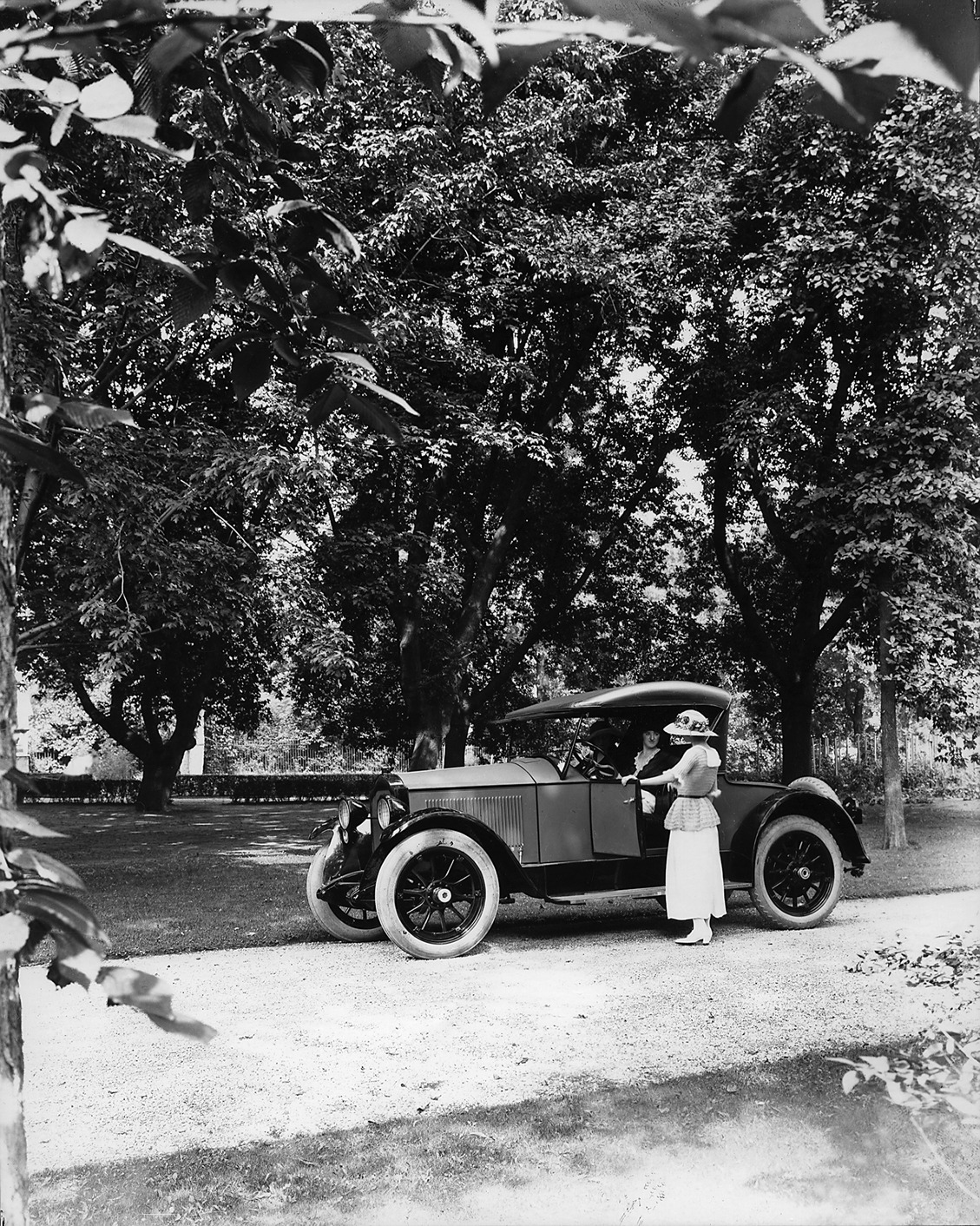 View of a 1921-1922 two-toned Packard seven-eights front left side view, parked on tree-lined drive, female driver and passenger, another female at open driver's side door. Inscribed on photo back: "Packard 116 first series single six, 6-cylinder, 52-horsepower at 2400-rpm, 116-inch wheelbase, 2-person prototype runabout (body type #191). Note the twin-six type headlamps and hood louvers. On pg. 167 A.Q. Packard book appears a retouched version of this same photograph, showing single-six type lamps and louvers."