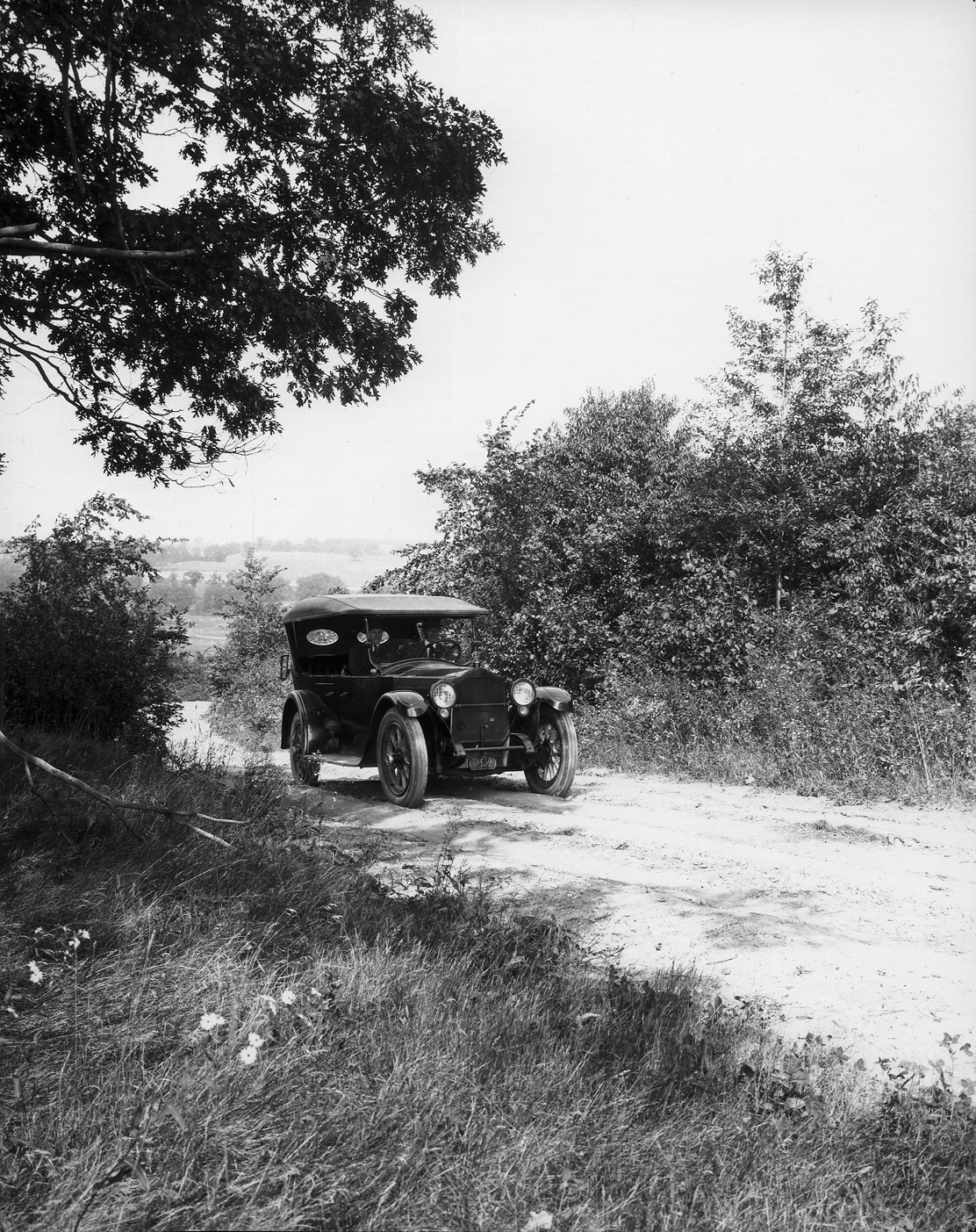 View of a 1920-1923 Packard, top raised, with male driver on country road. Inscribed on photo back: "Packard 3-35, third series twin-six (produced 8/1919-6/1923, oft called fourth series), 12-cylinder, 90-horsepower, 136-inch wheelbase, 7-person touring car (body type #194), 1920 Michigan dealer license plate #62M."