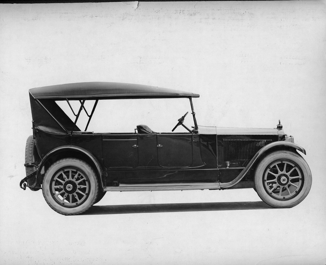View of a 1922-1923 Packard. Inscribed on photo back: "Packard 3-35, third series twin-six (produced 8/1919-6/1923, oft called fourth series), 12-cylinder, 90-horsepower, 136-inch wheelbase, 7-person touring car (body type #194), right elevation, top raised."