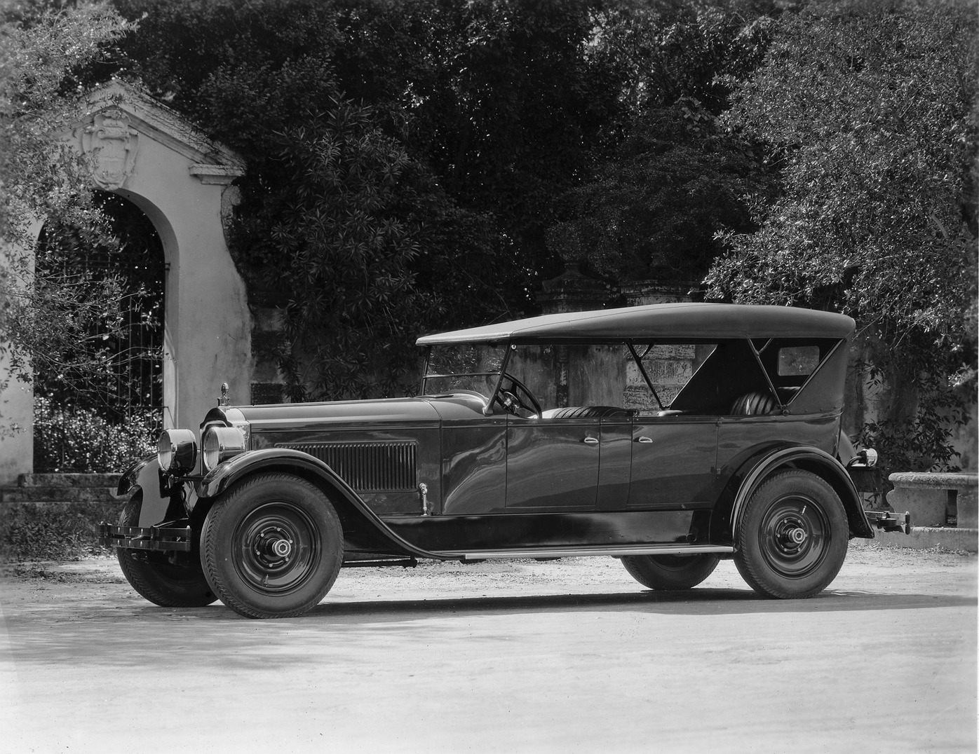 Favorite this☆ 1923 Packard touring car parked by stone arch Description: Packard Co. file photograph of a 1923 Packard touring car, seven-eights right front view, top raised, parked on street, stone gateway in background. Details Resource ID: EB01d103 Creator: Packard Motor Car Company Subject: Packard automobile Arches Photographic prints Date Issued: 1923 Format: 1 photographic print ; 8 x 10 in. Member of: National Automotive History Collection Packard Collection Rights: Physical rights are retained by DPL. Copyright is retained in accordance with U.S. copyright laws.