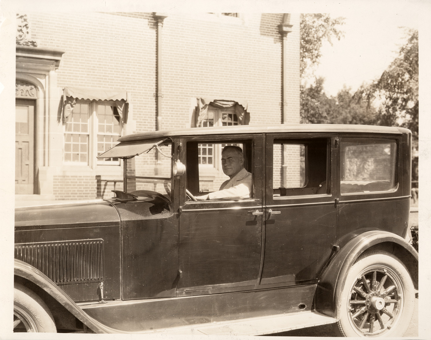 Packard Co. file photograph of a 1924 Packard, close-up of driver's side, brick building in background. Inscribed on photo back: "Packard six Model 226 sedan, with Fielding H. Yost, football coach at the University of Michigan, taken in Ann Arbor, Mich."