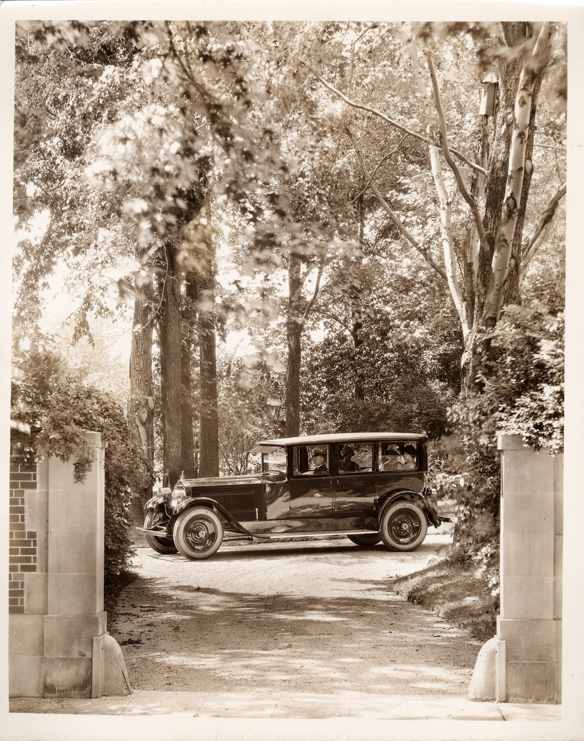 Packard Co. file photograph of a 1924 Packard nine-tenths left front view, chauffeur-driven, three female passengers, at stone gateway, trees in background. Inscribed on photo back: "Packard 143, first series single eight, 8-cylinder, 85-horsepower, 143-inch wheelbase, 7-person sedan (body type #240), earlier type single bar bumpers, at Newberry home, Grosse Pointe, Mich."