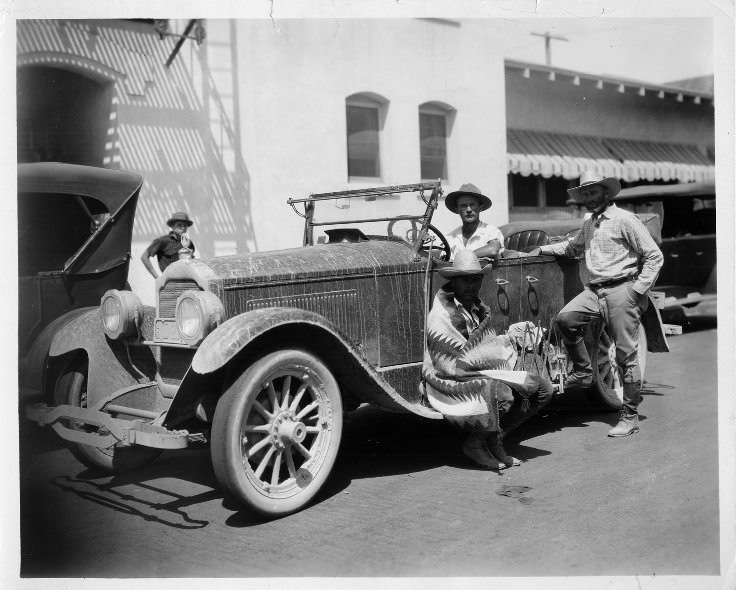 Packard Co. file photograph of a 1924 Packard, mud-spattered, front view, top lowered, male driver, two males at driver's side, one standing and other sitting on running board wrapped in Native American blanket, all in cowboy hats. Inscribed on photo back: "Packard 226, second series six (produced 12/27/1923-2/2/1925), 6-cylinder, 54-horsepower, 126-inch wheelbase, 5-person touring car (body type #220), 1925 California license plate #D 208, photographed in the Arizona Indian country."