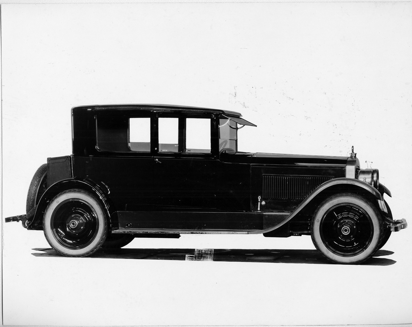 Packard Co. file photograph of a 1924 Packard right side view. Inscribed on photo back: "Packard 136, first series single eight (produced 6/14/1923-2/2/1925), 8-cylinder, 85-horsepower, 136-inch wheelbase, 5-person coupe (body type #242). Note early type bumpers, 5-lug wheels."