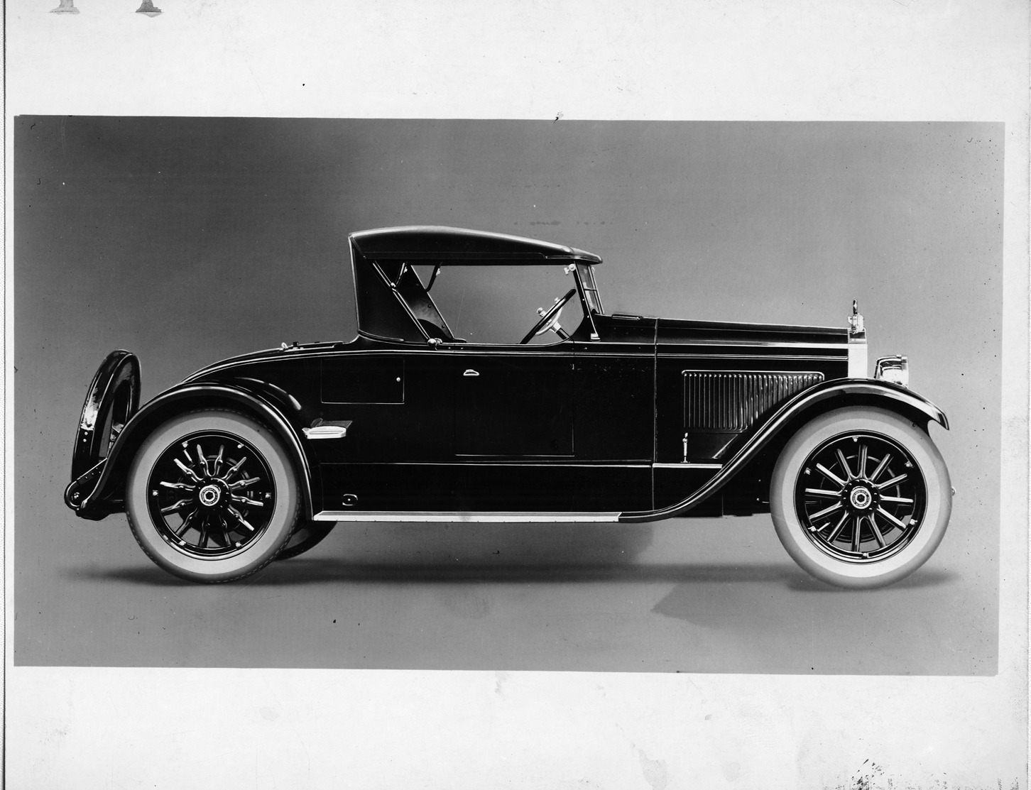 Packard Co. file photograph of a 1924 Packard. Inscribed on photo back: "Packard 226, second series six (produced 12/27/1923-2/2/1925), 6-cylinder, 54-horsepower, 126-inch wheelbase, 2/4-person runabout (body type #223), right elevation, top raised."