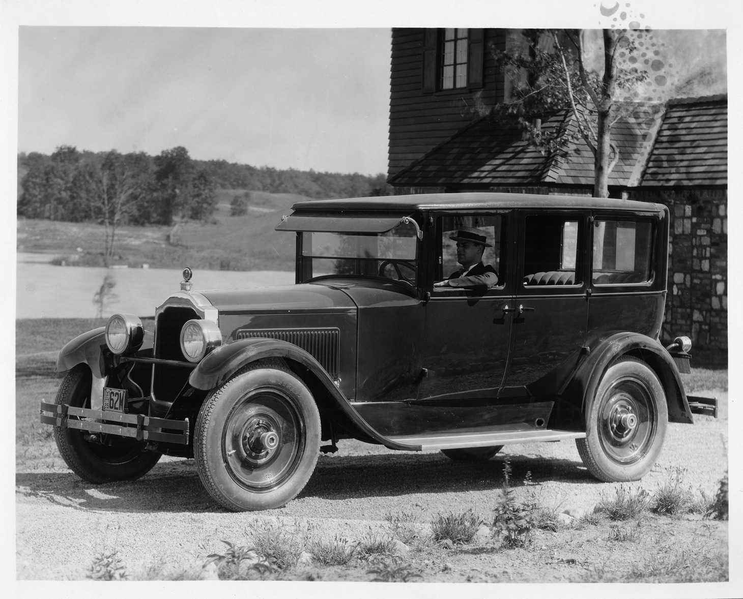 1925 Packard sedan, three-quarter left front view, male driver, parked in front of large home